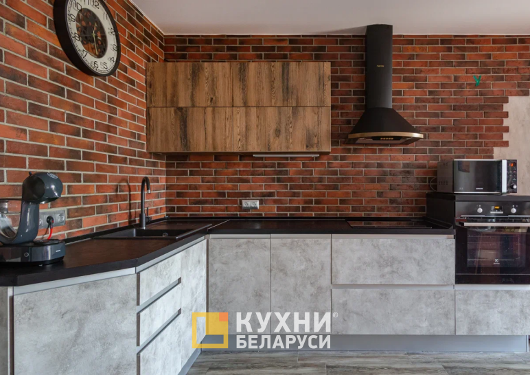 Цветовая гамма также заслуживает внимание. Верхние шкафы выполнены в древесном оттенке, нижние — в серо-белых тонах. Столешница сделана в цвете Вулкано. Такая трехцветная палитра придает гарнитуру особый шарм и делает его главным элементом на кухне.